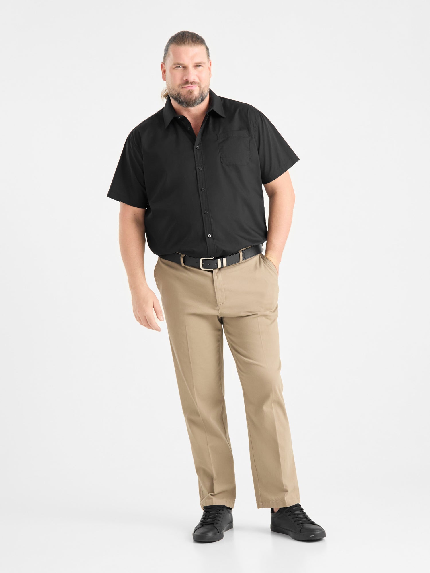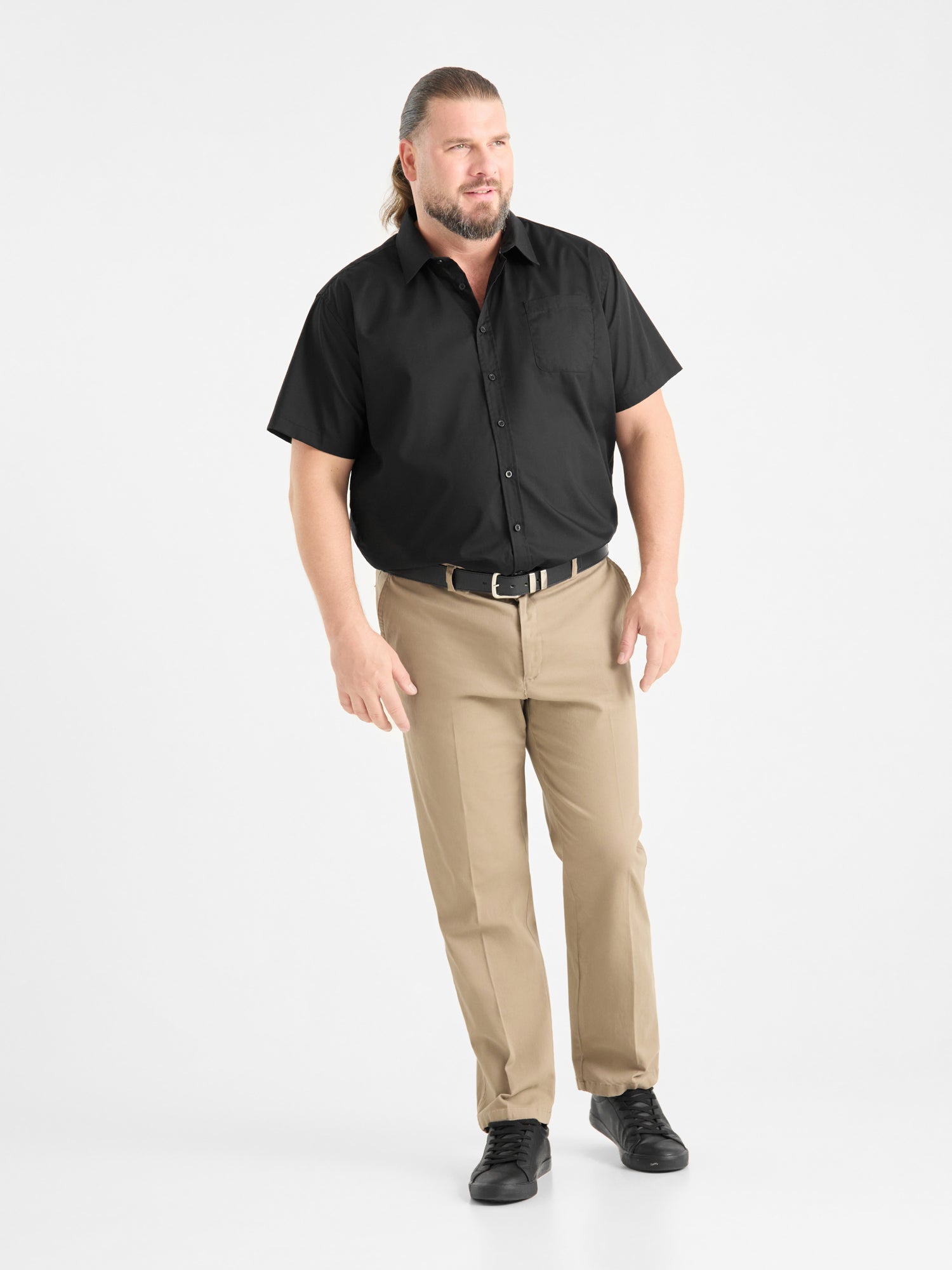 Duża męska koszula wizytowa krótki rękaw AERON D555 Czarna zaprojektowana z myślą o komforcie i uniwersalnym stylu. Koszula została wykonana z miękkiego, przyjemnego w dotyku materiału, który zapewnia wygodę nawet podczas długiego noszenia. Zastosowanie technologii easy iron ułatwia prasowanie i sprawia, że tkanina dłużej wygląda świeżo po praniu.